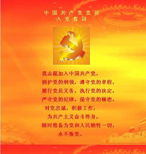 我志愿加入中國共產(chǎn)黨,  擁護黨的綱領(lǐng),遵守黨的章程,  履行黨員義務,執(zhí)行黨的決定,  嚴守黨的紀律,保守黨的秘密,  對黨忠誠,積極工作,  為共產(chǎn)主義……