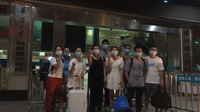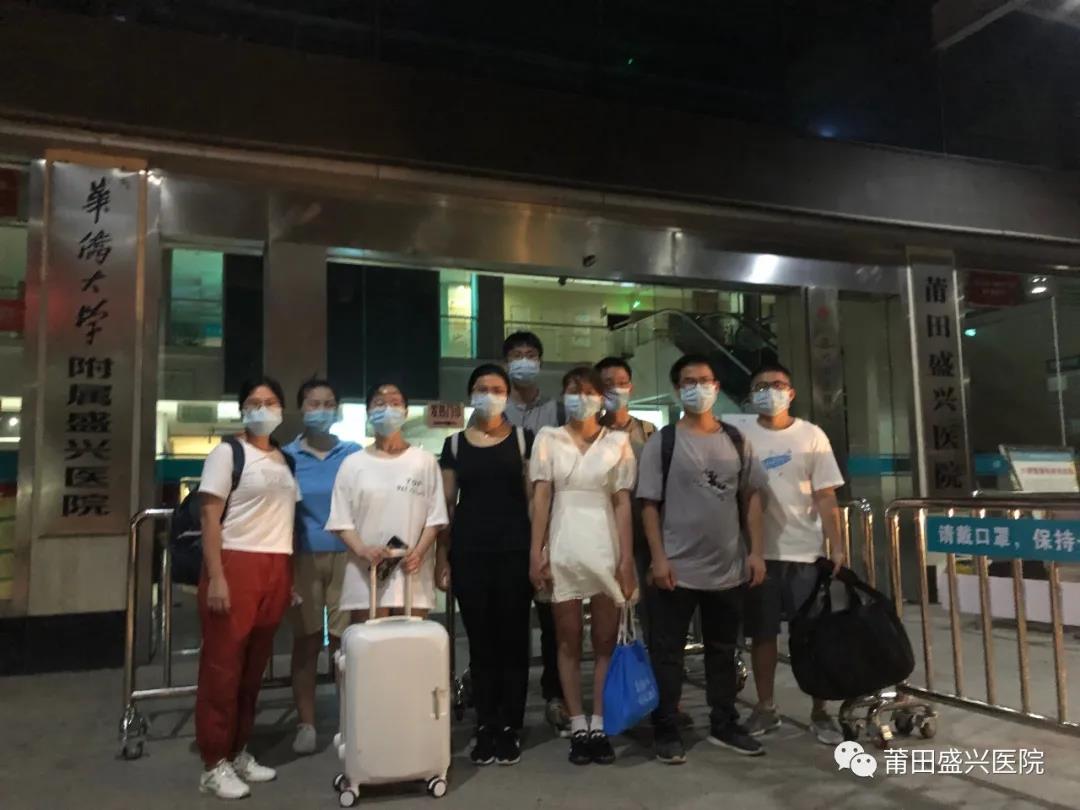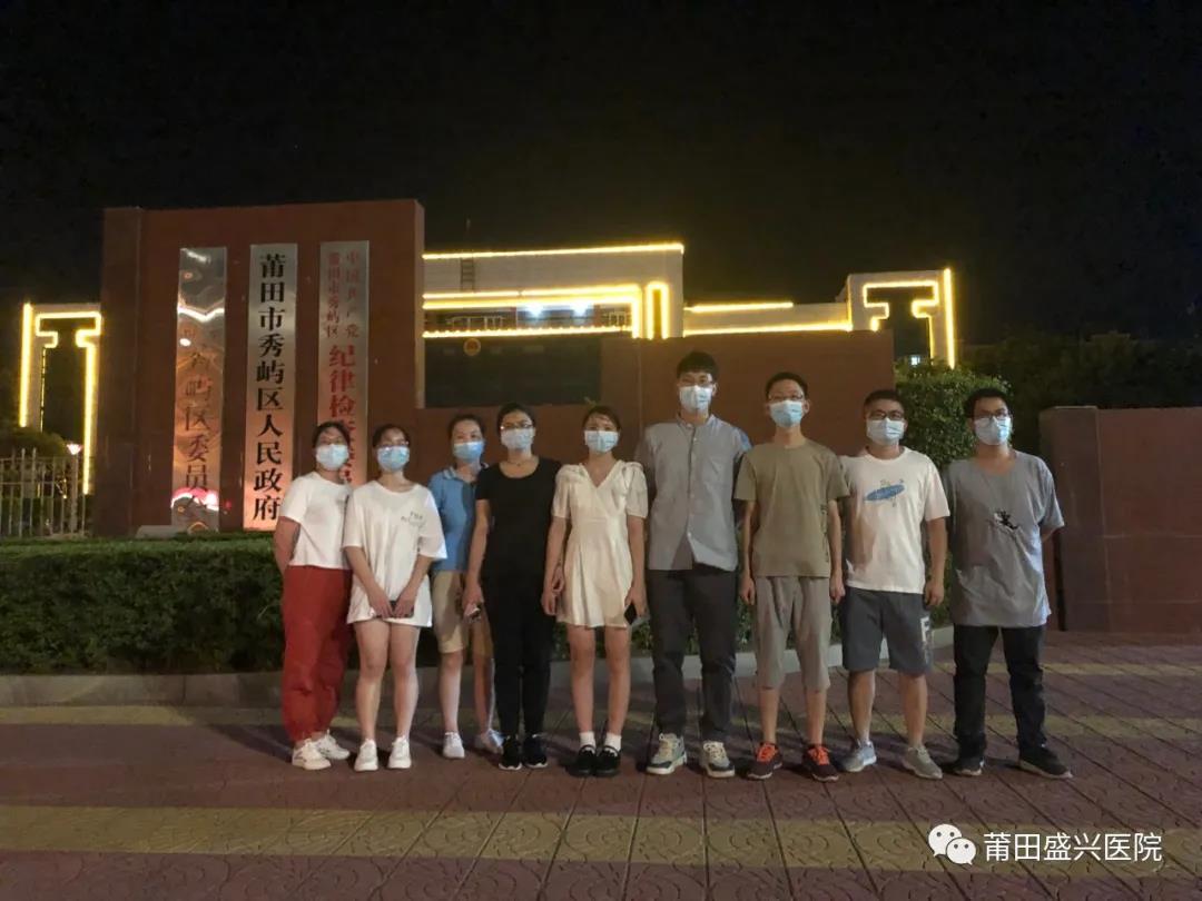 12日晚上11點(diǎn)30分左右,第三批9名醫(yī)護(hù)人員在秀嶼區(qū)政府大樓前合影。