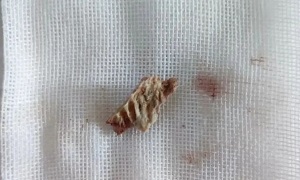 關主任小心翼翼地使用異物嵌把異物順利取出,原來是一塊骨頭,大概2*1.2cm,這塊骨性異物,多形又尖銳。成功取出異物后,關主任再次為其灌洗,直至局部周圍看不見膿性分泌物為止。整個過程十分順利。